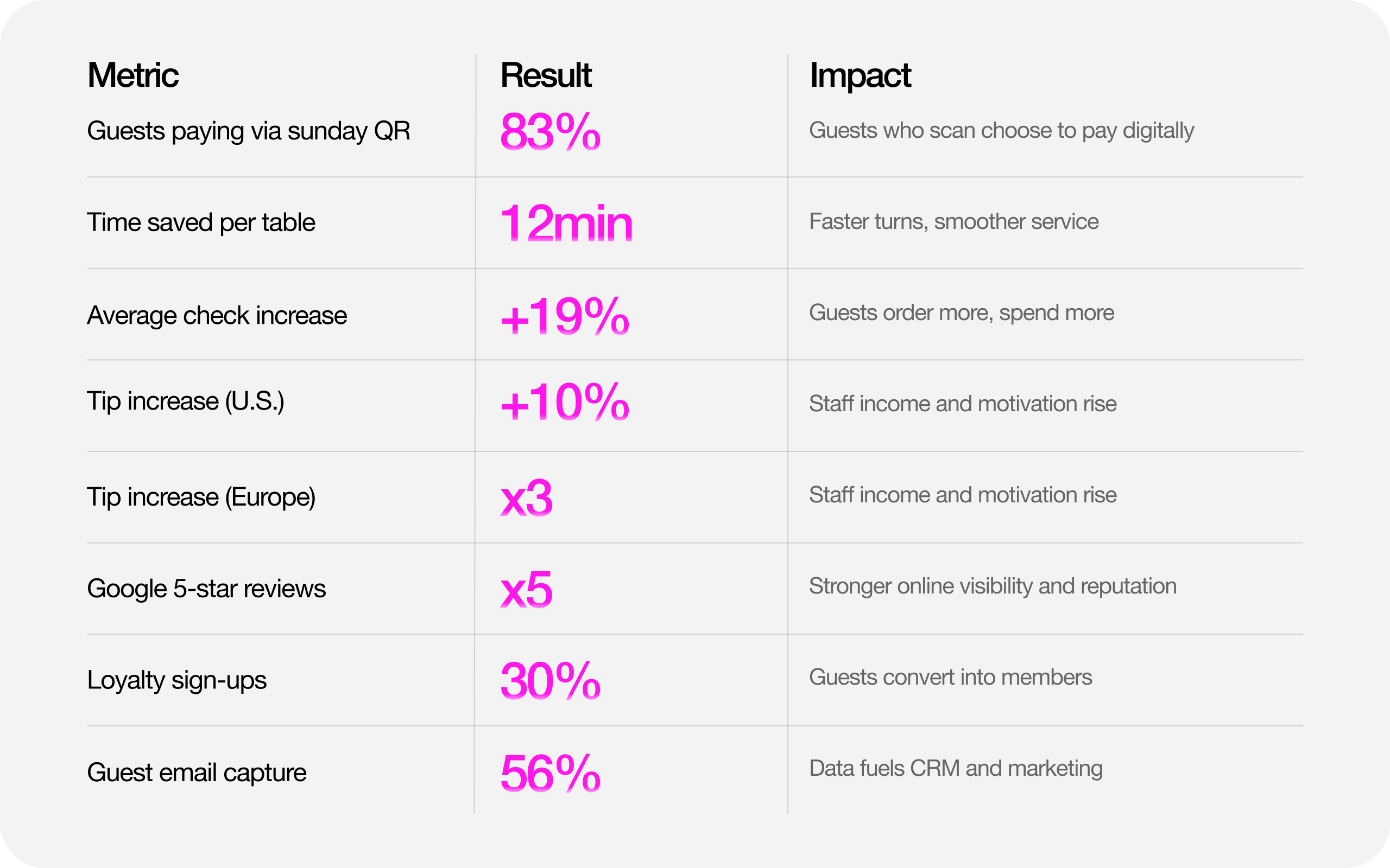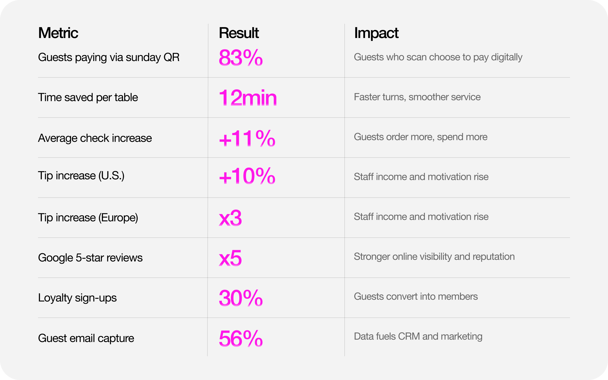While hospitality tech is crowded with promises, sunday’s impact is measurable, and proven across 80M+ payments and thousands of restaurants worldwide.