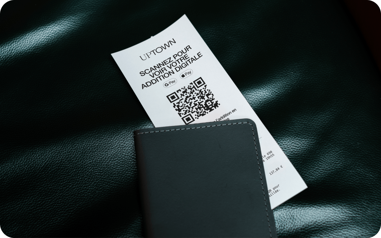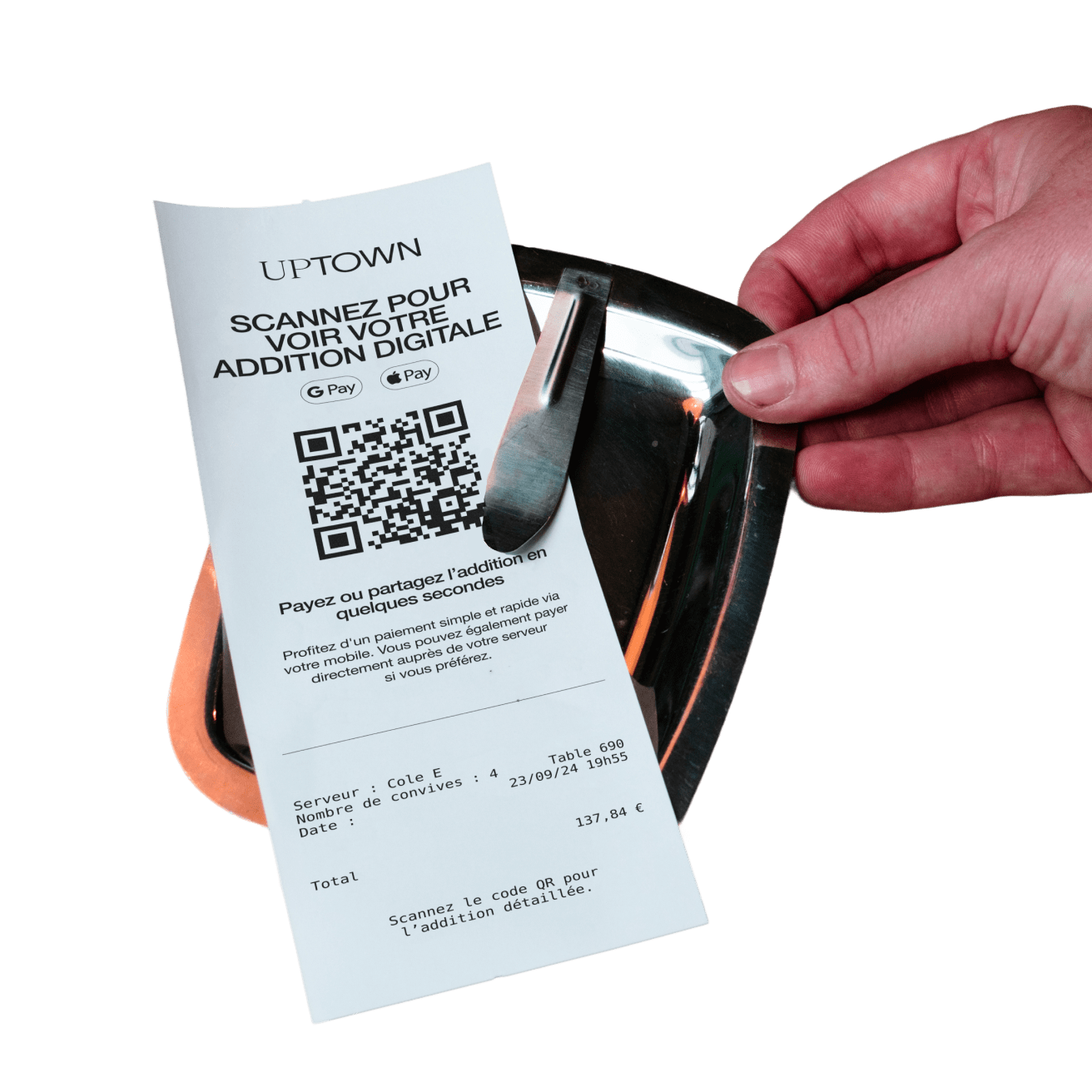 À la fin du repas, lorsque vos clients demandent l’addition, vos serveurs apportent un ticket comprenant un QR code unique leurs permettant de payer l’addition. Même si les clients ne scannent pas le QR code sur la table, vous gardez tous les bénéfices de sunday.